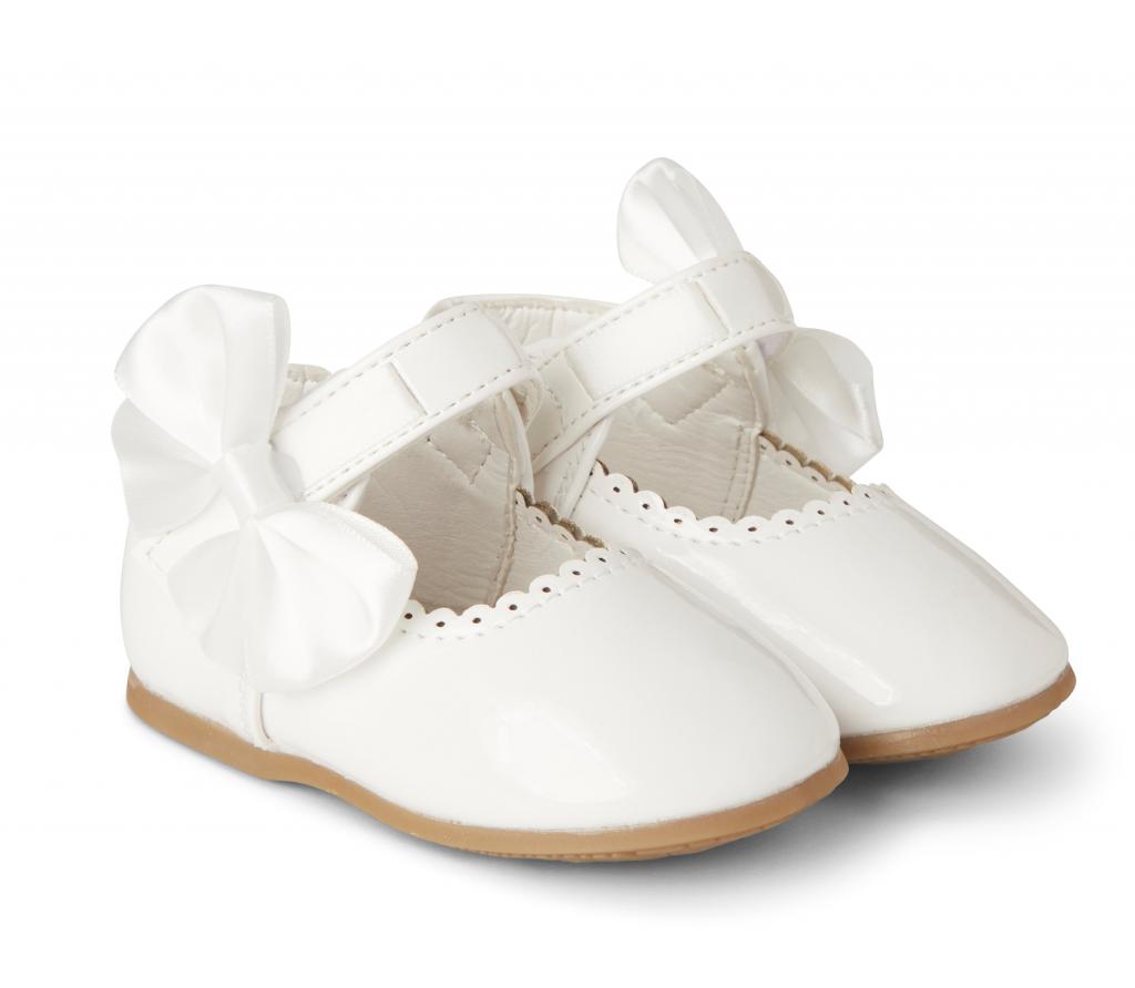 Velcro fastening shoe with ribbon bow and punch detailing.
