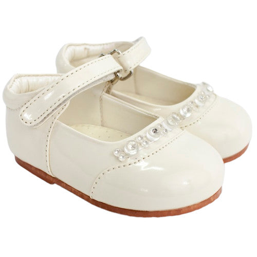 These shoes are of a ivory plain shiny patent. They have a strap with velcro fastening to the side with a stunning sparkly diamante trim across the front of each shoe.