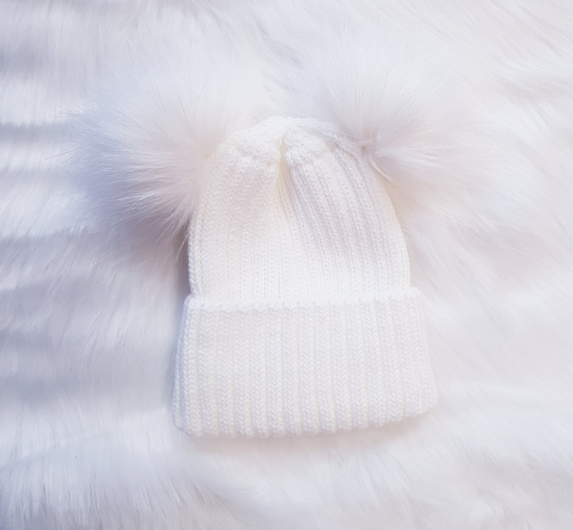 Little Chick White Ribbed Fur Double Pom Hat