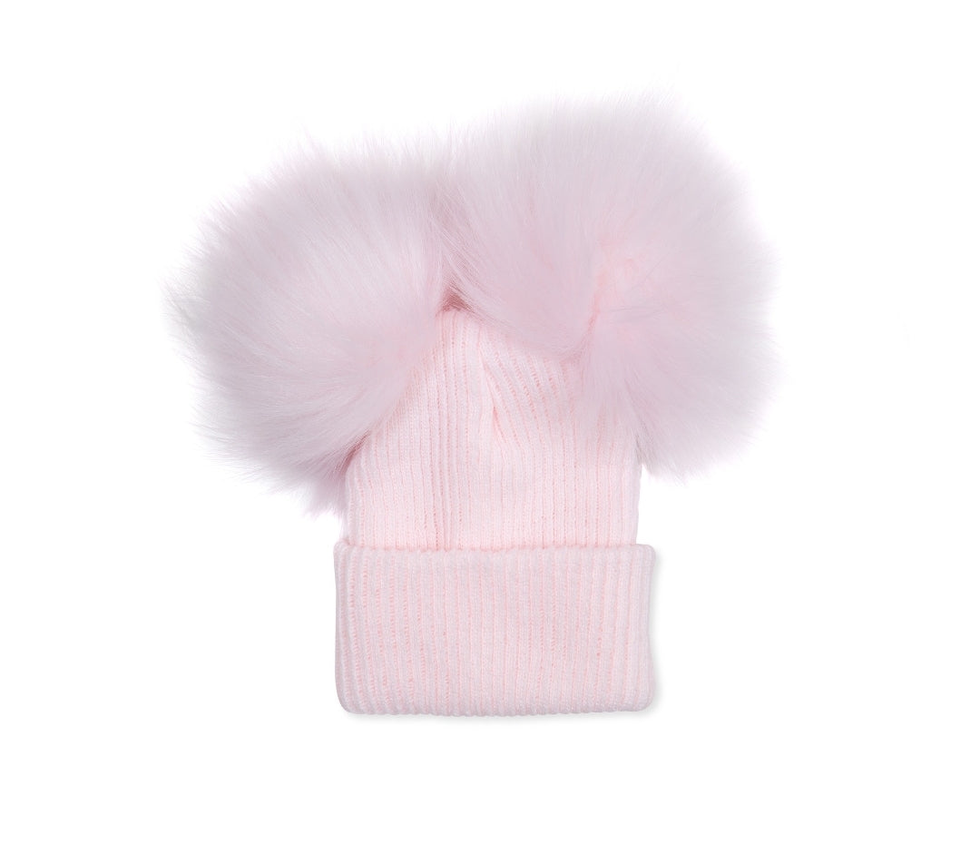 Knitted Pink Ribbed Fur Double Pom Pom Hat