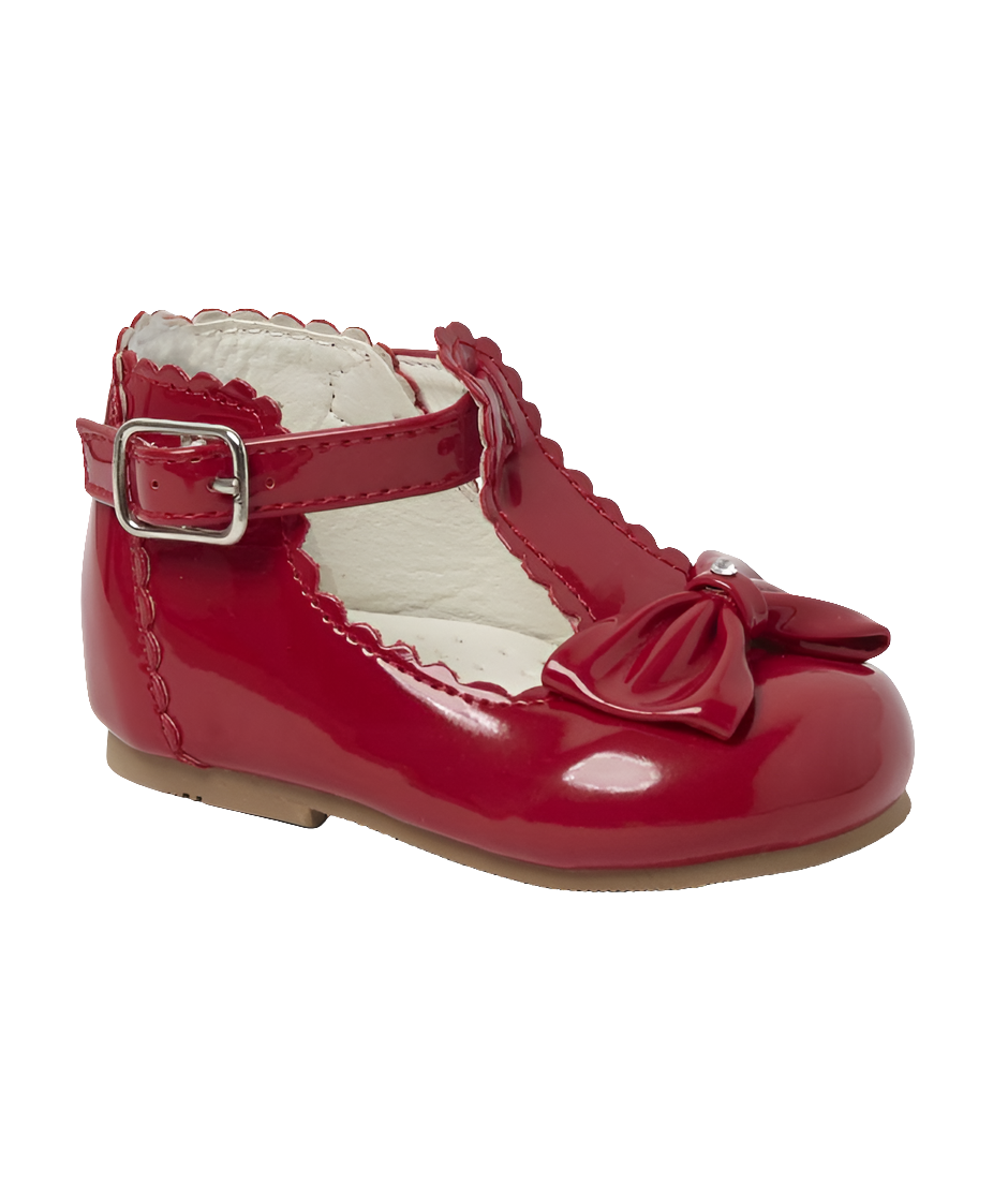 Red Patent T- Bar Shoes with Bow and Diamanté Detail and Buckle